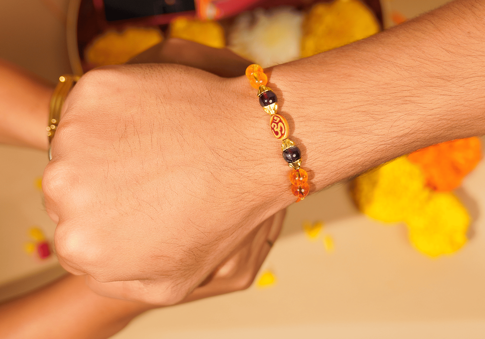 A Rakhi crafted with Citrine for success, Onyx for strength, and a sacred Om symbol for blessings. The perfect gift of love and positive energy.