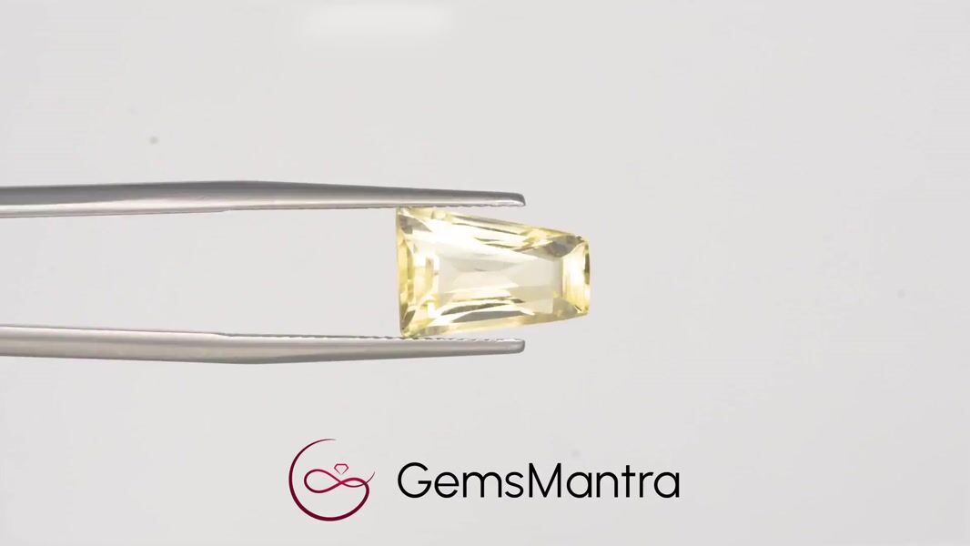 Natural Citrine features a bright golden-yellow shade that radiates warmth and light. Linked to Jupiter, it is known for supporting clarity, confidence, and attracting abundance. This 4.28-carat gemstone comes in a tapered/step shape with a sharp faceted cut that enhances its structured look, sourced from Brazil. The stone is certified for its natural origin and verified authenticity.