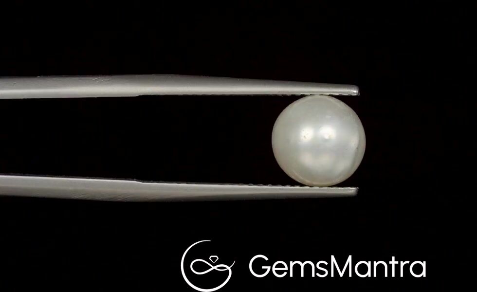 Glowing with a soft white sheen, the South Sea Pearl reflects sophistication and natural beauty. Known to attract peace, wealth, and emotional harmony, it holds strong astrological importance. Weighing 4.2 carats, its round shape and drop cabochon cut enhance its elegance. Authenticated and certified, it represents genuine purity and value.